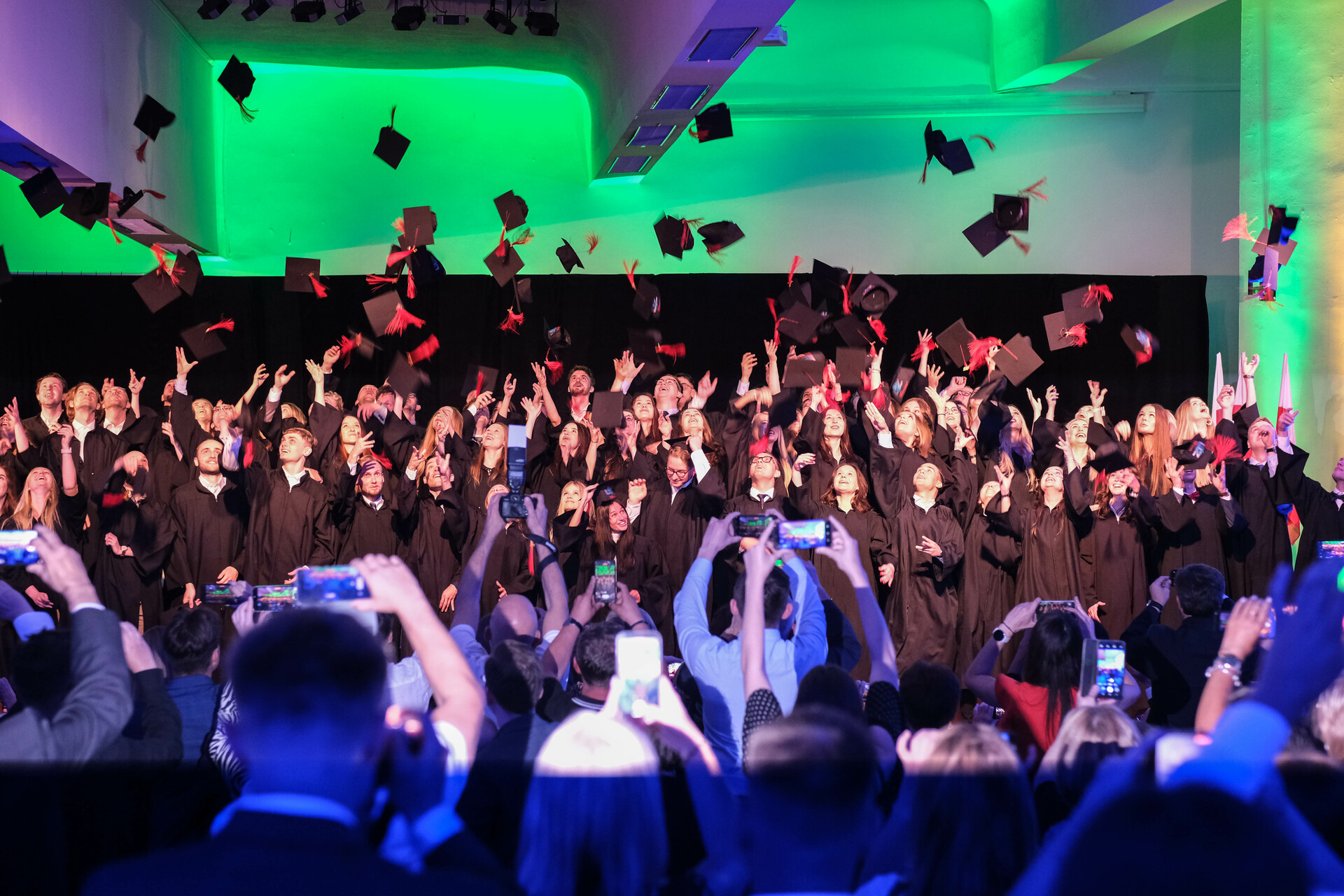 Absolwenci kierunku lekarskiego 2023 wykonują tradycyjny rzut biretem; fot. M. Adamczewski